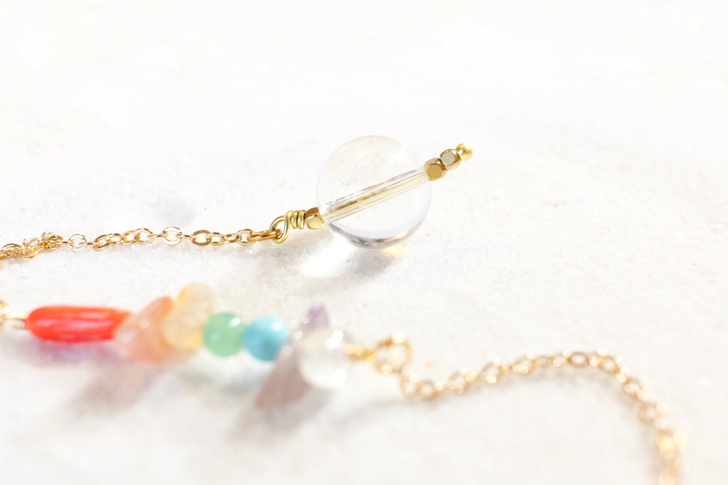 white sand with a delicate gold chain pendulum. the pendulum has chakra-themed beads on the chain, and a clear quartz end with little gold beads for a pointer at the end. close up of the chakra beads, which are white kunzite, amethyst, turquoise howlite, aventurine, citrine, sunstone + red coral