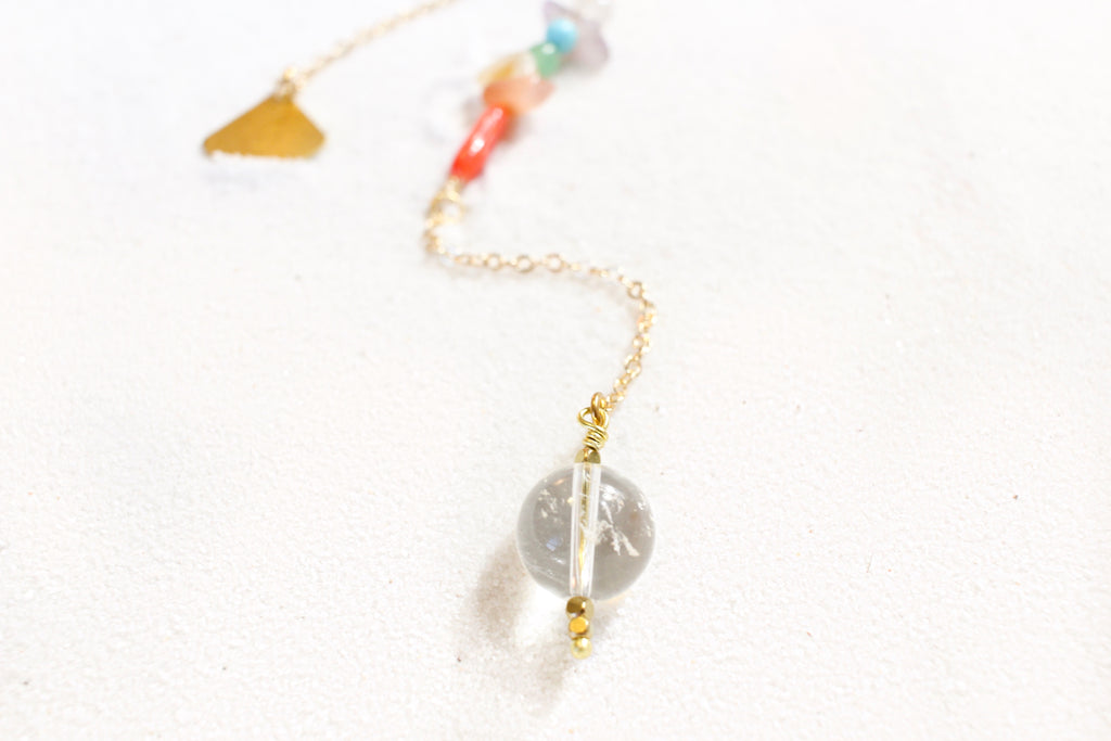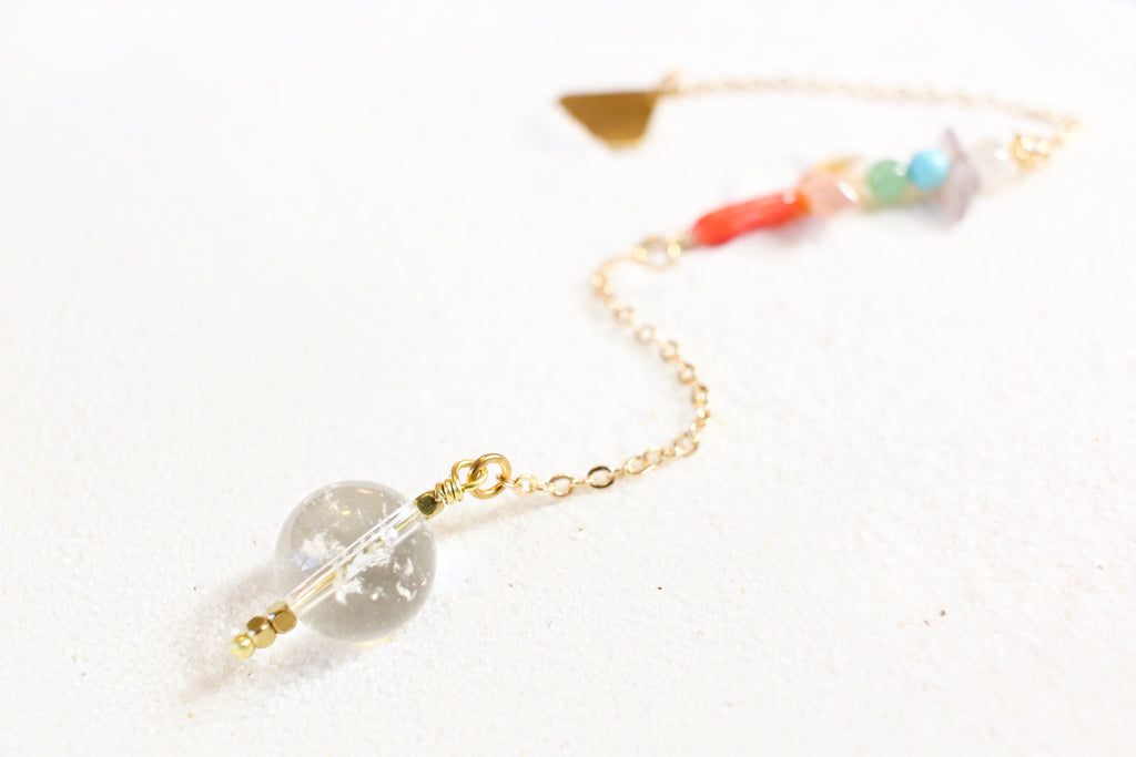 woman's hand holding the hold end of a pendulum with a delicate gold chain. the pendulum has chakra-themed beads on the chain, and a clear quartz end with little gold beads for a pointer at the end.